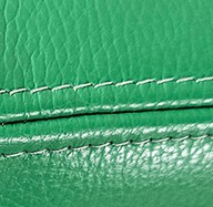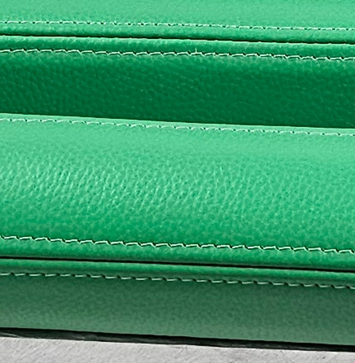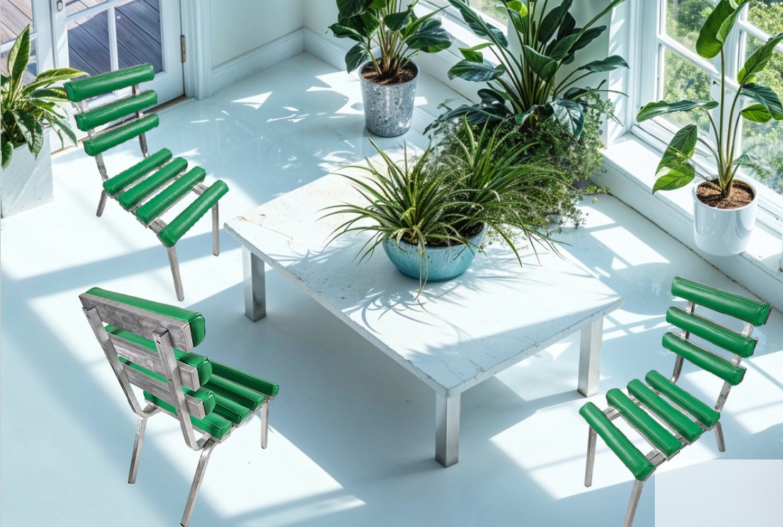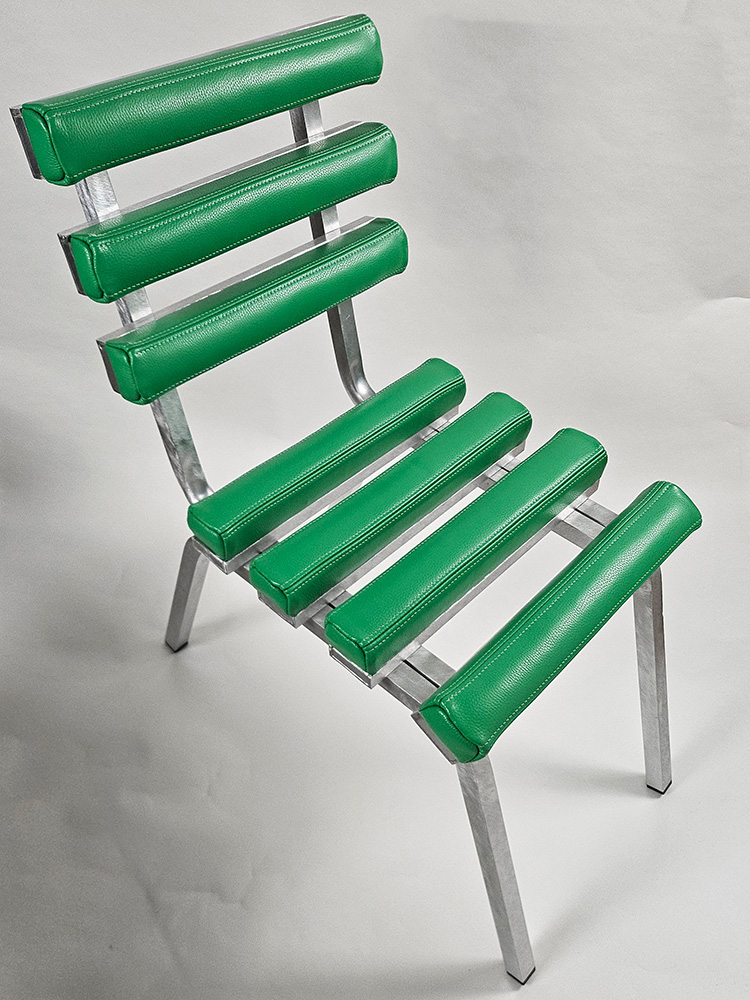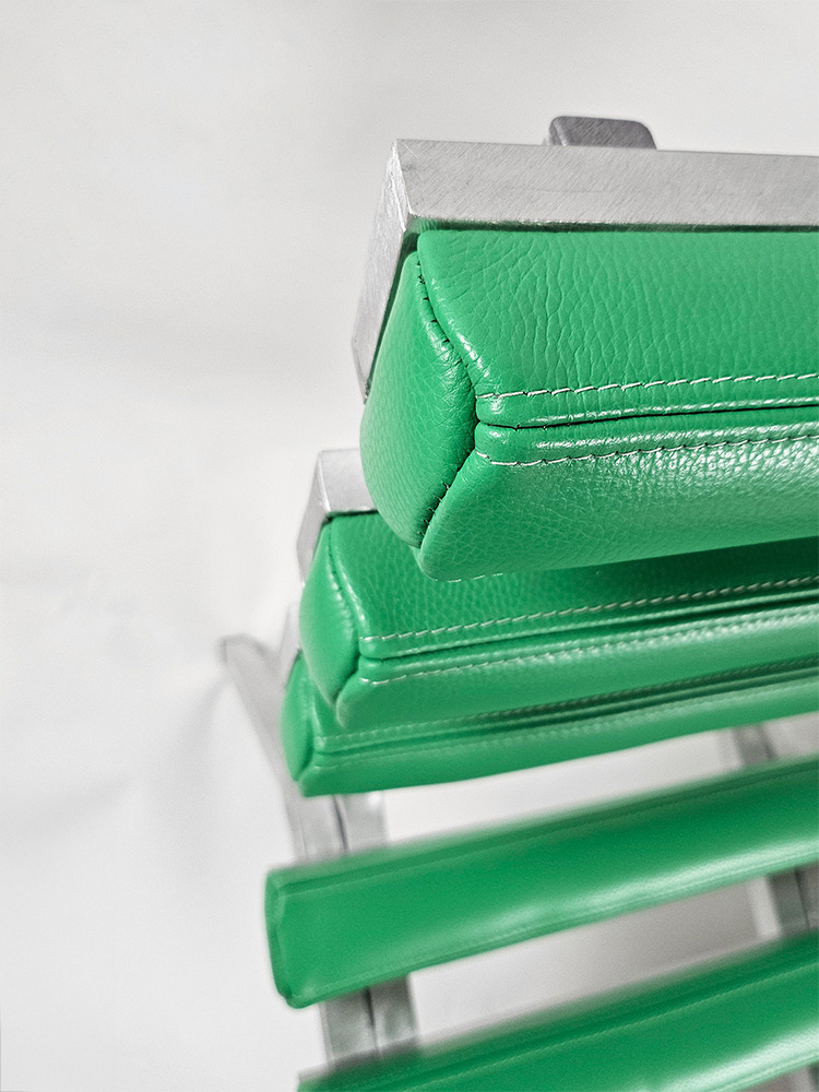 The frame is made of brushed aluminum, along with ribs that encase upholstered pads in clear green leather. The ribs are spaced proportionally to create airiness and let the aluminum shine from multiple angles.